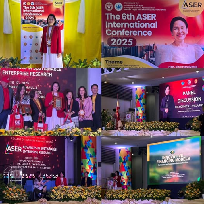 The 6th ASER 2025 International Research Conference at the University of the East Caloocan Campus on June 17, 2025, where she delivered a presentation on “Innovative Financing Models for Inclusive and Sustainable Business Practices”;
